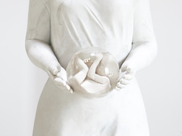 «So übergibt sie ihr Kind dem Arzt, der es tötet, dem Henker, dem Tod»: Statue in der Franz-Graf-Kapelle. Die Kapelle «Unschuldige Kinder» wurde 2008 eingeweiht. Ein Generalvikar und Pfarrer segneten sie. Errichtet wurde sie vom Bauern Franz Graf auf seinem eigenen Land. In Kritik gerieten Graf und seine Kapelle unter anderem wegen dort platzierten Holocaust- Vergleichen.