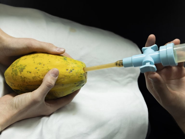 Medizinstudierende üben die Vakuumaspiration mithilfe einer Papaya. Da die Frucht in Form und Konsistenz einer Gebärmutter ähnelt, kann der Eingriff relativ einfach und kostengünstig geübt werden.