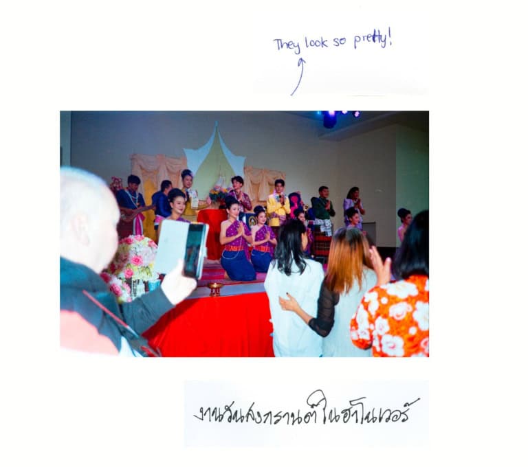 Um eine weitere Ebene zu schaffen und einen gemeinsamen Dialog über diese kulturellen «Clues» zu initiieren sowie eine persönliche und kooperative Ebene zu meinem Projekt hinzuzufügen, entschloss ich mich, die Bilder den Protagonist*innen zu zeigen und sie kommentieren zu lassen, was sie sahen. Es stellte sich heraus, dass viele der Dinge, wie zum Beispiel das traditionelle thailändische Gewand, das ich auf einem thailändischen Markt fotografiert hatte, der auf einem Parkplatz in Hannover stattfand, Erinnerungen in einer Protagonistin weckten.