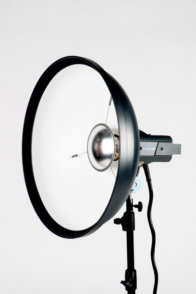 Dieser Lichtformer erzeugt ein weiches und gerichtetes Licht. Das Blitz- oder Dauerlicht wird von einem kleinen Reflektor, der in der Mitte des Beauty Dishes angebracht ist, zurückgeworfen und dann über die große, reflektierende Innenseite des Lichtformers nach vorne gelenkt.
